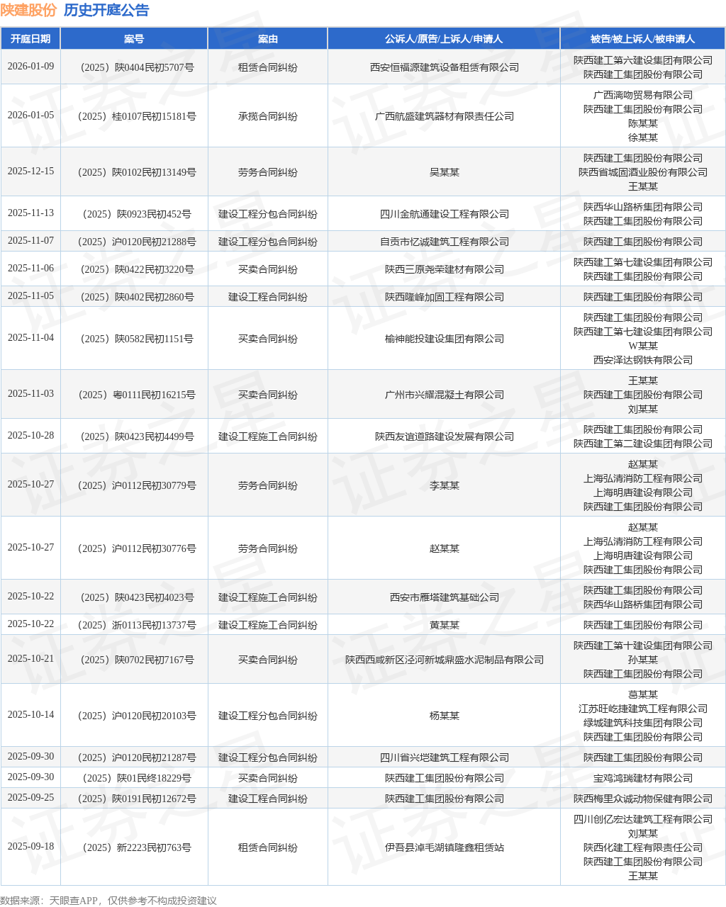案号:(2025)沪0120民初21288号根据统计,近一年内以陕西建工集团股份有限公司为当事人的历史开庭公告有275则,其中案由为“建设工程施工合同纠纷”的公告以69则居首,其次为“买卖合同纠纷”有54则,“建设工程分包合同纠纷”有33则。历史开庭公告(前20条)如下: