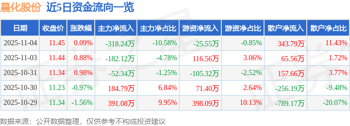 证券之星消息,截至2025年11月4日收盘,晨化股份(300610)报收于11.45元,上涨0.09%,换手率1.63%,成交量2.63万手,成交额3006.58万元。