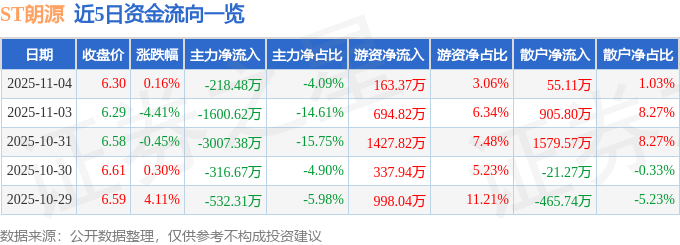 证券之星消息,截至2025年11月4日收盘,ST朗源(300175)报收于6.3元,上涨0.16%,换手率1.79%,成交量8.43万手,成交额5347.62万元。