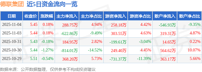证券之星消息,截至2025年11月4日收盘,德联集团(002666)报收于5.45元,上涨0.18%,换手率2.15%,成交量10.77万手,成交额5847.43万元。