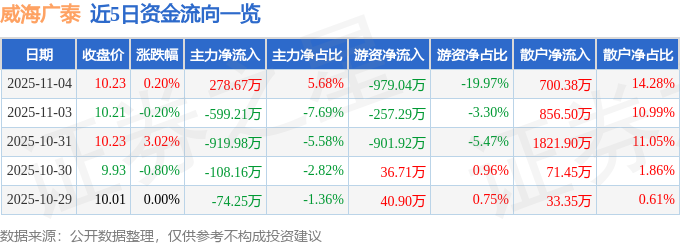 证券之星消息,截至2025年11月4日收盘,威海广泰(002111)报收于10.23元,上涨0.2%,换手率1.0%,成交量4.79万手,成交额4903.68万元。