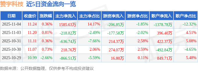 11月4日的资金流向数据方面,主力资金净流入1585.63万元,占总成交额14.17%,游资资金净流出206.85万元,占总成交额1.85%,散户资金净流出1378.78万元,占总成交额12.32%。