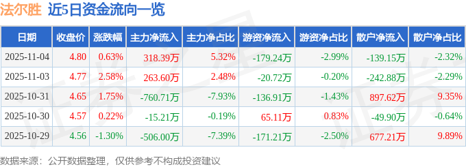 11月4日的资金流向数据方面,主力资金净流入318.39万元,占总成交额5.32%,游资资金净流出179.24万元,占总成交额2.99%,散户资金净流出139.15万元,占总成交额2.32%。