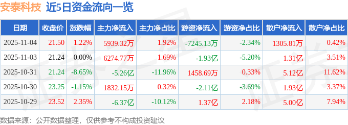 证券之星消息,截至2025年11月4日收盘,安泰科技(000969)报收于21.5元,上涨1.22%,换手率14.22%,成交量146.95万手,成交额31.0亿元。