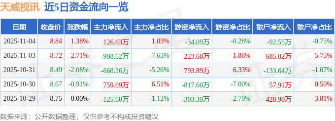证券之星消息,截至2025年11月4日收盘,天威视讯(002238)报收于8.84元,上涨1.38%,换手率1.76%,成交量14.09万手,成交额1.23亿元。