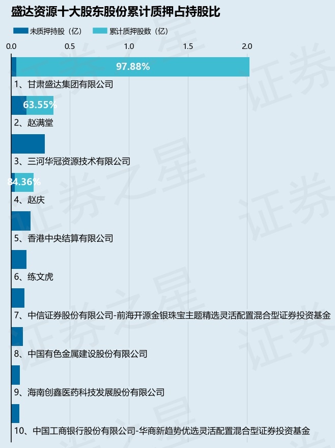截止本公告日,股东甘肃盛达集团有限公司已累计质押股份1.98亿股,占其持股总数的97.88%,股东赵满堂已累计质押股份2300.0万股,占其持股总数的63.55%,股东赵庆已累计质押股份1625.69万股,占其持股总数的84.36%。本次质押后盛达资源十大股东的累计质押股份占持股比例(占持股比例的计算以公司最新一期财务报表公布的十大股东的持股总数为基准)见下图: