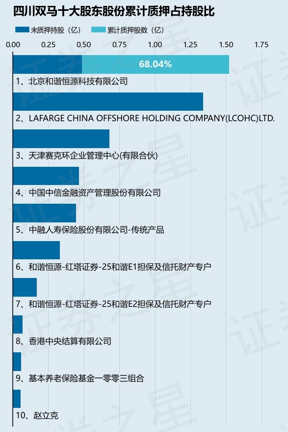 截止本公告日,股东北京和谐恒源科技有限公司已累计质押股份1.04亿股,占其持股总数的68.04%。本次质押后四川双马十大股东的累计质押股份占持股比例(占持股比例的计算以公司最新一期财务报表公布的十大股东的持股总数为基准)见下图: