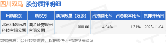证券之星消息,四川双马(000935)11月5日公开信息显示,股东北京和谐恒源科技有限公司向国金证券股份有限公司合计质押1000.0万股,占总股本1.31%。质押详情见下表: