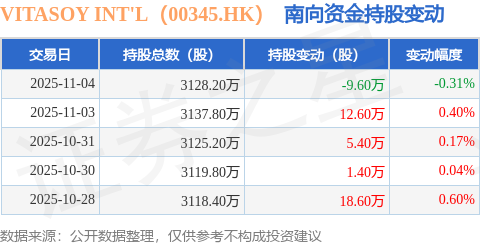 证券之星消息,11月4日南向资金减持9.6万股VITASOY INT'L(00345.HK)。近5个交易日中,获南向资金增持的有4天,累计净增持28.4万股。近20个交易日中,获南向资金增持的有18天,累计净增持146.8万股。截至目前,南向资金持有VITASOY INT'L(00345.HK)3128.2万股,占公司已发行普通股的2.97%。