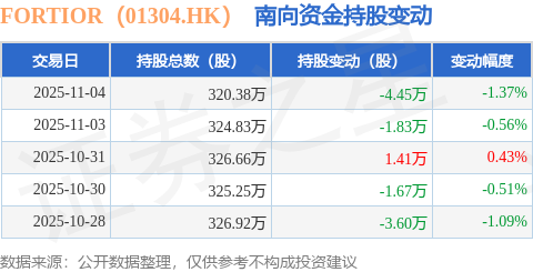 证券之星消息,11月4日南向资金减持4.45万股FORTIOR(01304.HK)。近5个交易日中,获南向资金减持的有4天,累计净减持10.14万股。近20个交易日中,获南向资金减持的有9天,累计净减持2501.0股。截至目前,南向资金持有FORTIOR(01304.HK)320.38万股,占公司已发行普通股的14.85%。