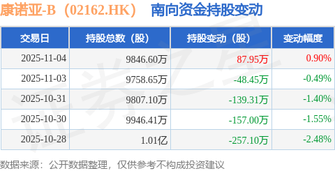 证券之星消息,11月4日南向资金增持87.95万股康诺亚-B(02162.HK)。近5个交易日中,获南向资金减持的有4天,累计净减持513.91万股。近20个交易日中,获南向资金减持的有15天,累计净减持909.77万股。截至目前,南向资金持有康诺亚-B(02162.HK)9846.6万股,占公司已发行普通股的32.95%。