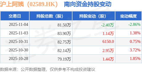 证券之星消息,11月4日南向资金减持2.4万股沪上阿姨(02589.HK)。近5个交易日中,获南向资金增持的有4天,累计净增持3.74万股。近20个交易日中,获南向资金减持的有12天,累计净减持8.76万股。截至目前,南向资金持有沪上阿姨(02589.HK)81.5万股,占公司已发行普通股的1.36%。