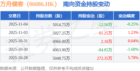 证券之星消息,11月4日南向资金减持12.5万股方舟健客(06086.HK)。近5个交易日中,获南向资金增持的有3天,累计净增持238.35万股。近20个交易日中,获南向资金增持的有11天,累计净增持69.2万股。截至目前,南向资金持有方舟健客(06086.HK)5014.75万股,占公司已发行普通股的3.73%。