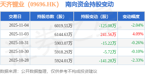 证券之星消息,11月4日南向资金减持125.08万股天齐锂业(09696.HK)。近5个交易日中,获南向资金减持的有4天,累计净减持45.74万股。近20个交易日中,获南向资金减持的有13天,累计净减持255.08万股。截至目前,南向资金持有天齐锂业(09696.HK)6019.55万股,占公司已发行普通股的36.67%。