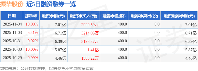 振华股份融资融券信息显示,融资方面,当日融资买入1.33亿元,融资偿还1.03亿元,融资净买入2990.59万元,连续3日净买入累计1.14亿元。融券方面,融券卖出0.0股,融券偿还0.0股,融券余量400.0股,融券余额1.12万元。融资融券余额7.01亿元。