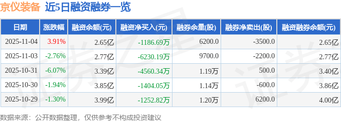 京仪装备融资融券信息显示,融资方面,当日融资买入3101.52万元,融资偿还4288.2万元,融资净偿还1186.69万元。融券方面,融券卖出300.0股,融券偿还3800.0股,融券余量6200.0股,融券余额54.44万元。融资融券余额2.65亿元。