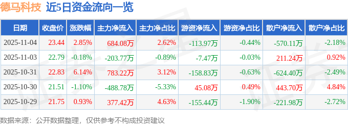 证券之星消息,截至2025年11月4日收盘,德马科技(688360)报收于23.44元,上涨2.85%,换手率4.48%,成交量11.3万手,成交额2.61亿元。