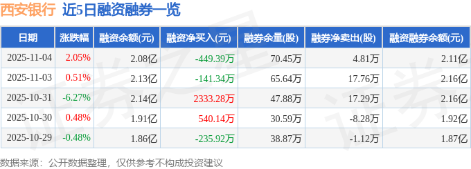 证券之星消息,截至2025年11月4日收盘,西安银行(600928)报收于3.99元,上涨2.05%,换手率1.16%,成交量51.35万手,成交额2.03亿元。