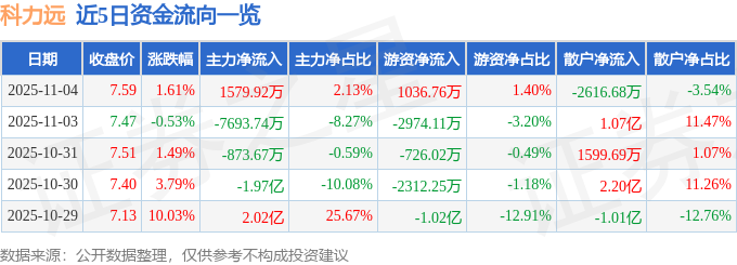 证券之星消息,截至2025年11月4日收盘,科力远(600478)报收于7.59元,上涨1.61%,换手率5.89%,成交量98.09万手,成交额7.4亿元。