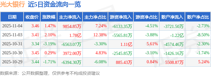 证券之星消息,截至2025年11月4日收盘,光大银行(601818)报收于3.46元,上涨1.47%,换手率0.85%,成交量393.93万手,成交额13.61亿元。