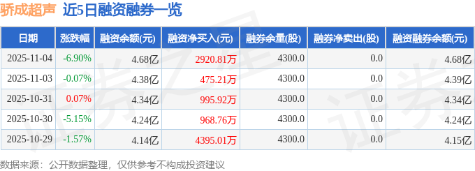骄成超声融资融券信息显示,融资方面,当日融资买入5742.46万元,融资偿还2821.65万元,融资净买入2920.81万元,连续3日净买入累计4391.94万元。融券方面,融券卖出0.0股,融券偿还0.0股,融券余量4300.0股,融券余额43.83万元。融资融券余额4.68亿元。