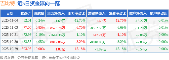 11月4日的资金流向数据方面,主力资金净流出1.69亿元,占总成交额12.75%,游资资金净流入1.69亿元,占总成交额12.76%,散户资金净流出15.27万元,占总成交额0.01%。