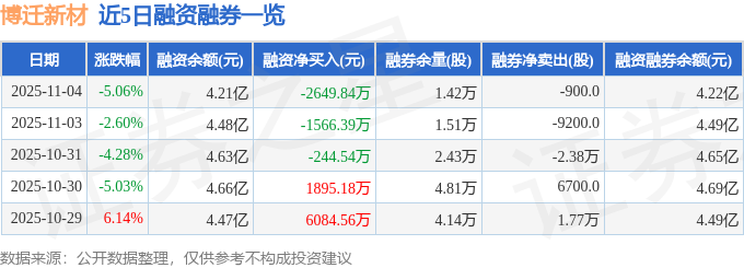 博迁新材融资融券信息显示,融资方面,当日融资买入3067.09万元,融资偿还5716.93万元,融资净偿还2649.84万元。融券方面,融券卖出0.0股,融券偿还900.0股,融券余量1.42万股,融券余额71.14万元。融资融券余额4.22亿元。