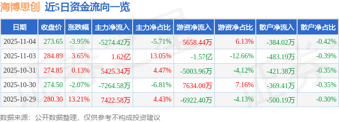 证券之星消息,截至2025年11月4日收盘,海博思创(688411)报收于273.65元,下跌3.95%,换手率8.77%,成交量3.33万手,成交额9.24亿元。