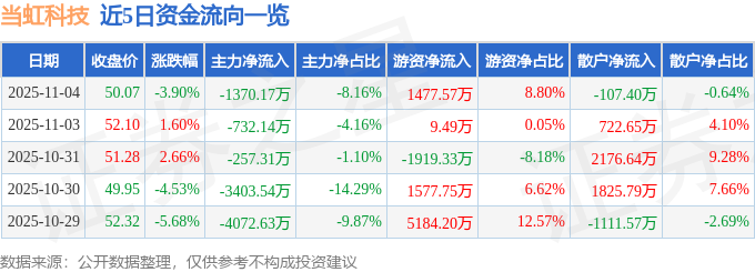 证券之星消息,截至2025年11月4日收盘,当虹科技(688039)报收于50.07元,下跌3.9%,换手率3.02%,成交量3.34万手,成交额1.68亿元。
