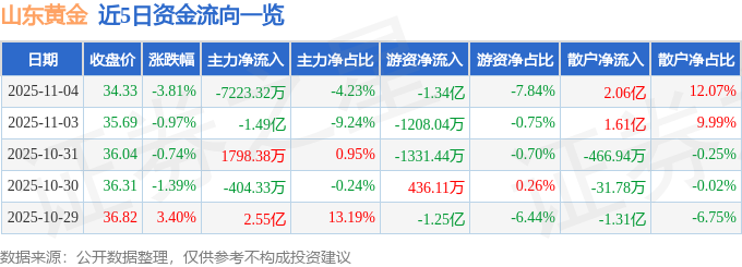 证券之星消息,截至2025年11月4日收盘,山东黄金(600547)报收于34.33元,下跌3.81%,换手率1.37%,成交量49.41万手,成交额17.07亿元。