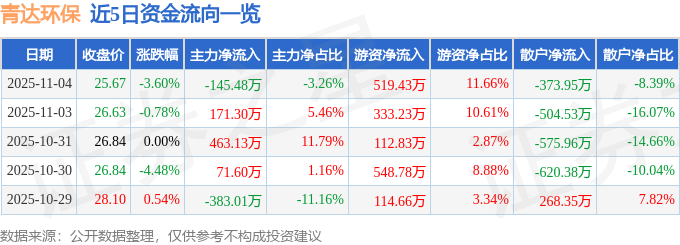证券之星消息,截至2025年11月4日收盘,青达环保(688501)报收于25.67元,下跌3.6%,换手率1.39%,成交量1.72万手,成交额4456.24万元。