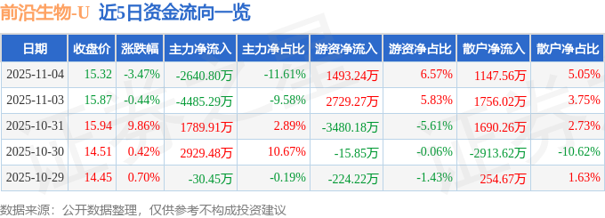 证券之星消息,截至2025年11月4日收盘,前沿生物(688221)报收于15.32元,下跌3.47%,换手率3.93%,成交量14.71万手,成交额2.27亿元。