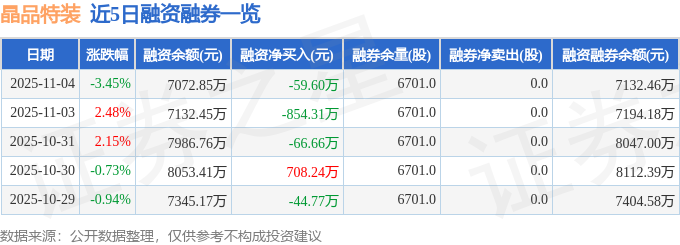 晶品特装融资融券信息显示,融资方面,当日融资买入424.38万元,融资偿还483.98万元,融资净偿还59.6万元。融券方面,融券卖出0.0股,融券偿还0.0股,融券余量6701.0股,融券余额59.61万元。融资融券余额7132.46万元。