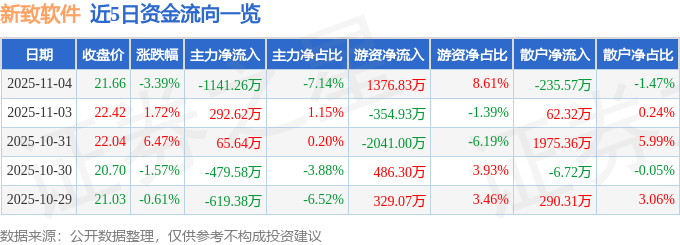证券之星消息,截至2025年11月4日收盘,新致软件(688590)报收于21.66元,下跌3.39%,换手率2.8%,成交量7.37万手,成交额1.6亿元。