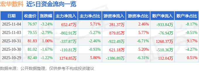 证券之星消息,截至2025年11月4日收盘,宏华数科(688789)报收于76.97元,下跌3.24%,换手率0.82%,成交量1.47万手,成交额1.14亿元。