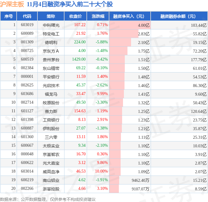 沪深主板融资净买入前三分别为:中科曙光(603019)融资净买入4亿元、特变电工(600089)融资净买入2.83亿元、德明利(001309)融资净买入2.1亿元,前20具体见下表: