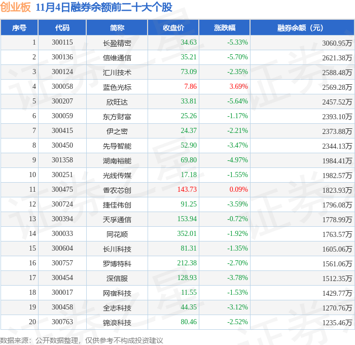 创业板融券余额前三分别为:长盈精密(300115)融券余额3060.95万元、信维通信(300136)融券余额2621.38万元、汇川技术(300124)融券余额2588.48万元,前20具体见下表:
