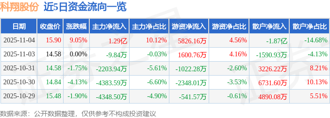 证券之星消息,截至2025年11月4日收盘,科翔股份(300903)报收于15.9元,上涨9.05%,换手率24.77%,成交量81.31万手,成交额12.77亿元。