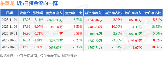 证券之星消息,截至2025年11月4日收盘,东富龙(300171)报收于17.07元,下跌5.11%,换手率5.45%,成交量30.69万手,成交额5.28亿元。