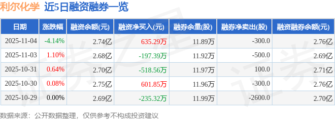 利尔化学融资融券信息显示,融资方面,当日融资买入1988.79万元,融资偿还1353.51万元,融资净买入635.29万元。融券方面,融券卖出0.0股,融券偿还300.0股,融券余量11.89万股,融券余额146.05万元。融资融券余额2.76亿元。