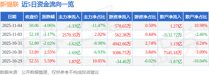 证券之星消息,截至2025年11月4日收盘,新强联(300850)报收于50.06元,下跌4.06%,换手率7.65%,成交量23.02万手,成交额11.61亿元。