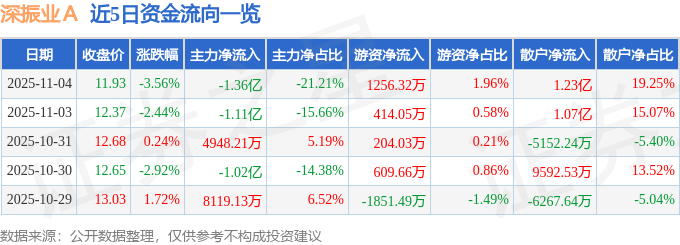 证券之星消息,截至2025年11月4日收盘,深振业A(000006)报收于11.93元,下跌3.56%,换手率3.94%,成交量53.24万手,成交额6.4亿元。