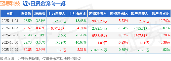 11月4日的资金流向数据方面,主力资金净流出2.93亿元,占总成交额18.48%,游资资金净流入9099.28万元,占总成交额5.73%,散户资金净流入2.02亿元,占总成交额12.74%。
