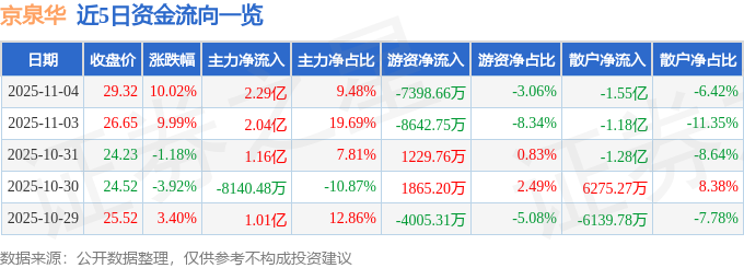 证券之星消息,截至2025年11月4日收盘,京泉华(002885)报收于29.32元,上涨10.02%,已连续涨停2天,换手率36.47%,成交量84.2万手,成交额24.16亿元。