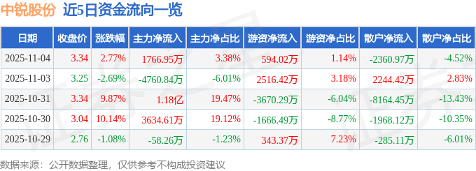 证券之星消息,截至2025年11月4日收盘,中锐股份(002374)报收于3.34元,上涨2.77%,换手率14.74%,成交量160.01万手,成交额5.23亿元。