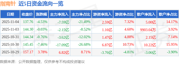 证券之星消息,截至2025年11月4日收盘,指南针(300803)报收于137.76元,下跌4.53%,换手率4.23%,成交量25.31万手,成交额35.33亿元。