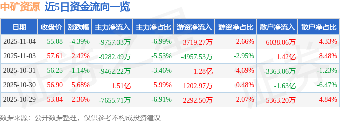 证券之星消息,截至2025年11月4日收盘,中矿资源(002738)报收于55.08元,下跌4.39%,换手率3.52%,成交量25.02万手,成交额13.96亿元。