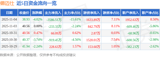 证券之星消息,截至2025年11月4日收盘,德迈仕(301007)报收于38.93元,下跌4.02%,换手率3.85%,成交量5.9万手,成交额2.3亿元。