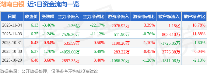 证券之星消息,截至2025年11月4日收盘,湖南白银(002716)报收于6.13元,下跌3.46%,换手率4.27%,成交量99.2万手,成交额6.13亿元。