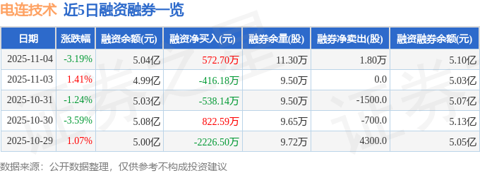 电连技术融资融券信息显示,融资方面,当日融资买入2789.68万元,融资偿还2216.99万元,融资净买入572.7万元。融券方面,融券卖出1.82万股,融券偿还200.0股,融券余量11.3万股,融券余额558.9万元。融资融券余额5.1亿元。